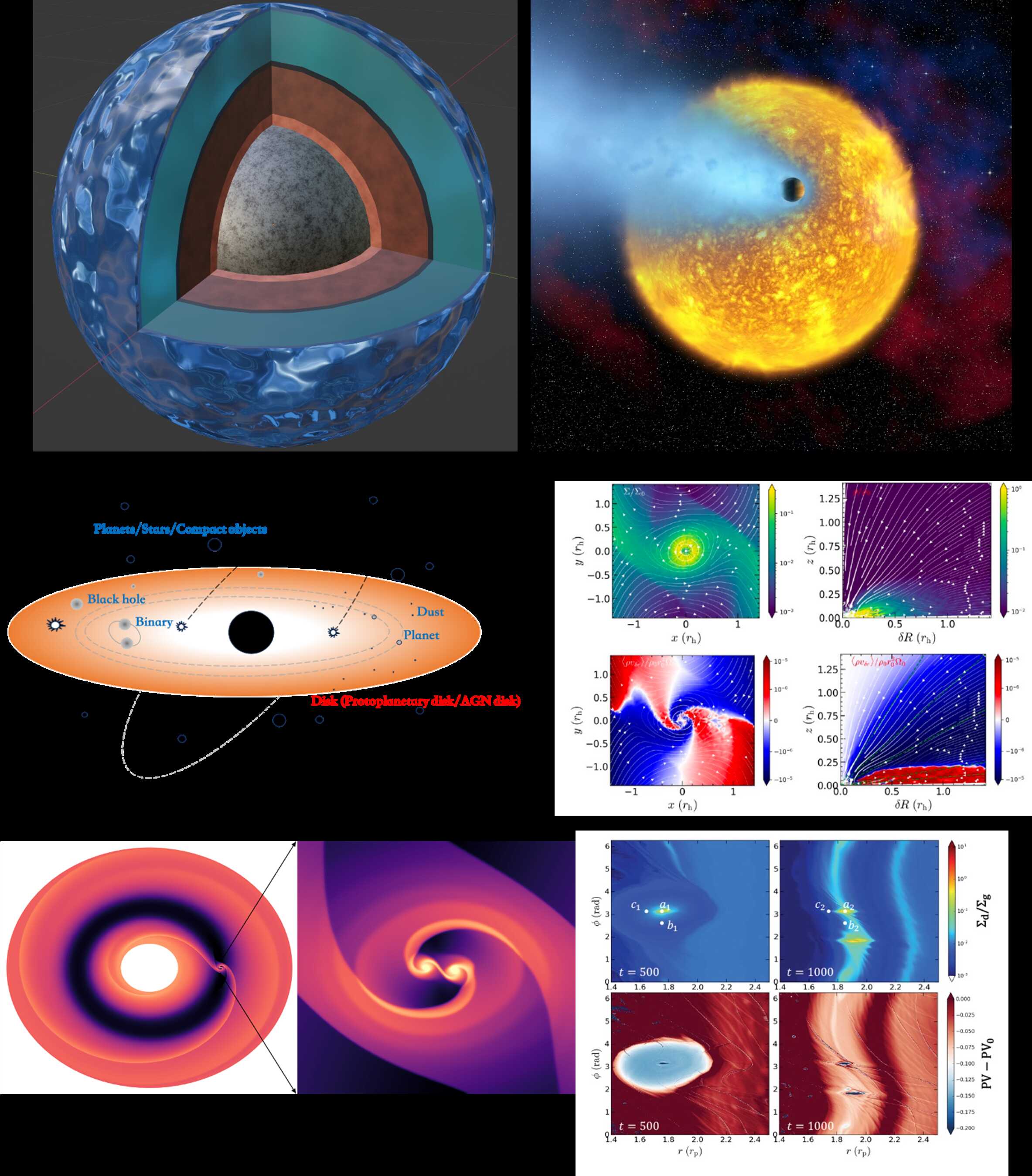 Theoretically, the main research interest of our group is the planet formation and evolution via multi-fluid hydrodynamical simulations, including the dynamics of gas and dust in protoplanetary disks, planet-disk interactions. Another key aspect of our research involves the accretion physics of compact objects such as black holes.